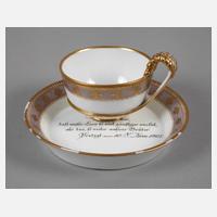 blaue Schwertermarke Marcolinizeit mit Stern, Untertasse mit Aufschrift: ”Wer sind wir, dass unser Loos so viel günstiger ausfiel, als das, so vieler unserer Brüder.” Predigt am ...1807, Tasse in Campanerform mit hochgezogenem, blattverziertem Henkel, violette Streifenbordüre mit Reliefgoldmalerei, Vergoldung etwas berieben, sonst guter und unbeschädigter Zustand, H zusammen ca. 8 cm.