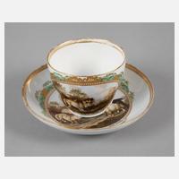 Marcolinizeit um 1800, blaue Schwertermarke mit Stern und Nr. 4, zweifach gebauchte Tasse mit verschlungenen Asthenkeln, feine polychrome Aufglasurbemalung, radierte Goldmalerei, in einer ovalen Kartusche Hütehund und Wolf in sommerlicher Landschaft mit Ruine, passende Untertasse mit ähnlicher Darstellung, bezeichnet ”Le Loup et le Chien” ( Der Wolf und der Hund) und ”Le Loup le Bouc et la Brebis” (Der Wolf, die Ziege und das Mutterschaf), Vergoldung etwas berieben, H zusammen ca. 7 cm.