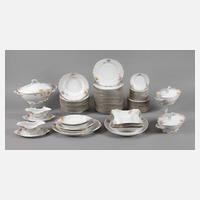 um 1900, einige Teile gemarkt, gepinselte Dekornummer 5707, pastelltonige Aufglasurbemalung, geschweifte Goldränder, reliefierter Blütendekor mit Blattranken, bestehend aus einer großen und zwei kleineren Deckelterrinen, einer großen runden Vorlegeplatte, zwei plus zwei rechteckigen Schüsseln, fünf verschieden großen ovalen Platten, elf Desserttellern, zwölf Abendbrottellern, zwölf Suppentellern und dreiundzwanzig Speisetellern, guter Zustand, L max. 36 cm.