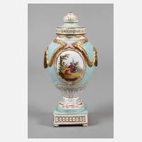 19. Jh., blaue Zeptermarke, Fußvase mit aufgelegten Lorbeerranken als Festons, beidseitig polychrom bemalte Kartuschen mit verschiedenen Watteauszenen, restauriert, im Fuß brandrissig (nur von unten sichtbar), H 26 cm.