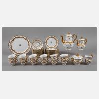 blaue Schwertermarken nach 1934, 4 x gestrichen, feine polychrome Aufglasurbemalung, reiche teilradierte Vergoldung auf den ornamentalen Reliefs, bestehend aus Kernstück mit zusätzlicher Mokkakanne, zwölf Gedecken und einer Tortenplatte, ungebraucht, in sehr gutem Zustand, H Kaffeekanne 26 cm.