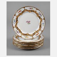 blaue Schwertermarke nach 1934, 1. Wahl, verschiedene Präge- und Pinselnummern, kobaltblaue Unterglasurbemalung mit Vergoldung, flache Speiseteller mit gewelltem Rand, guter unbeschädigter Zustand, D 25,5 cm.