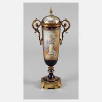 Frankreich, 1. Hälfte 19. Jh., signiert, Mittelteil aus Porzellan mit feiner Malerei in goldradierten Kartuschen, schauseitig Mütter mit Kindern, rückseitig jeweils Bauernhäuser in sommerlichen Landschaften, feuervergoldete Bronzemontierungen, klassizistischer Fuß, seitlich Löwenköpfe mit beweglichen Ringen, Einsätze aus Messingblech, beide am oberen Rand gerissen, einer zusätzlich gedellt, insgesamt jedoch guter altersgemäßer Zustand, H je 37 cm.
