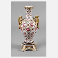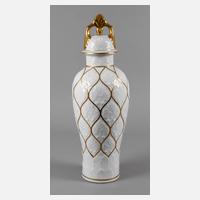 um 1920, blaue Pinselmarke, Schriftzug ”Modelè et décoration exclusive á la main” (Handbemalt), zweiteilig verschraubt, polychrom bemalt, bedruckt und reich vergoldet, gefußte bauchige Vase, die seitlichen Henkel aus Voluten und Palmetten, Gebrauchsspuren, etwas berieben, H 37 cm.