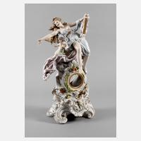 Mitte 20. Jh., blaue Stempelmarke, Modellnummer 1900, aufsitzend eine leicht bekleidete Lyraspielerin mit wallendem Tuch, dazu zwei Putten und aufgelegte Blüten, goldkonturierte Rocaillen und Muschelmotive, Uhrwerk fehlt, an den Blüten minimalst bestoßen, sonst guter Zustand, H 49 cm, D für Uhrwerk vorn 6,4 cm, D hinten 8,2 cm.