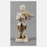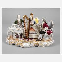 20. Jh., blaue Stempelmarke, gepinselt II W, feine polychrome Aufglasurbemalung und Vergoldung, Musikanten mit Cembalo und Harfe, auf einem rocaillenverziertem Sockel, dieser mit plastischen Blüten besetzt, diese minimal bestoßen, ein Finger fehlt, Kleid rückseitig beschädigt, L 40 cm.