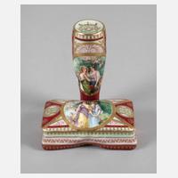 2. Hälfte 19. Jh., roter, grüner und blauer Stempel sowie Rest eines Klebeetiketts, bezeichnet ”Chateau des Tuileries”, kobaltblauer Font, schauseitig feine polychrome Bemalung, signiert Kowiecka?, Reliefgoldmalerei, Mädchen mit Schirm und Rosenblütenstrauß in Landschaft, abnehmbarer Deckel, normale Altersspuren, H 39 cm.