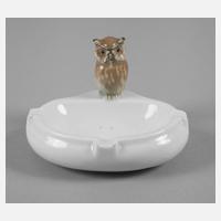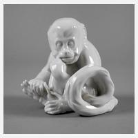 1. Hälfte 20. Jh., blaue Pinselmarke ”Aelteste Volkstedter Porzellanmanufaktur”, Unterglasurbemalung und Vergoldung, in naturalistischer Ausformung auf einem Sockel sitzend, guter unbeschädigter Zustand, L 14 cm.