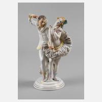 Entwurf Gustav Oppel um 1920, monogrammiert, blaue Pinselmarke ”Aelteste Volkstedter Porzellanmanufaktur”, Aufglasurbemalung und Vergoldung, Pierrot und Ballerina in Pose, auf einem Rundsockel stehend, am Rock minimal bestoßen, H 28 cm.