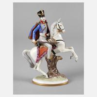 Mitte 20. Jh., blaue Stempelmarke ”Aelteste Volkstedter Porzellanmanufaktur”, Modellnummer 2113, Aufglasurbemalung und Vergoldung, die Säbelklinge aus Metall, Zügel und Steigbügel aus goldenem Kordelband (eines gerissen), guter Zustand, H 18 cm.