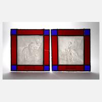 um 1900, Biskuitporzellan, Darstellung zweier herrschaftlicher Damen im Interieur, beim Beten beziehungsweise nachdenklich, in roter und blauer Bleiverglasung mit Wandaufhängungen, ein Glas gerissen, sonst normale Altersspuren, je 23 x 21 cm.