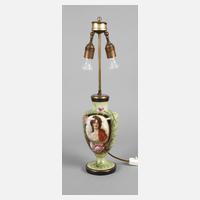 um 1900, ungemarkt, polychrom bemalt, bedruckt, emailliert und vergoldet, in blütengerahmter Kartusche Portrait einer jungen Zigeunerin, Messingmontierung, zweiflammig elektrifiziert, ohne Schirm, funktionstüchtig, Altersspuren, H 60 cm.