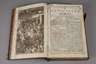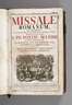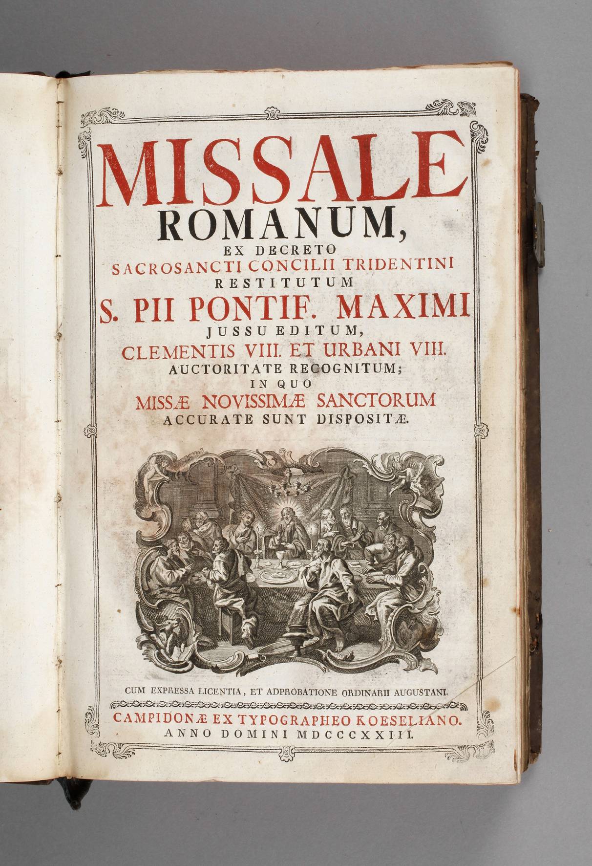 ex decreto sacrosancti concilii tridentini restitutum S. Pii Pontif. Maximi jussu editum, Clementis VIII. et Urbani VIII., Kempten bei Kösel/Campidonae ex typographeo Koeseliano 1823, Format 4°, 23 Blatt und 582 S. sowie XLIX und XXXVIII S. und 17 S., Majuskelholzschnitte, wenige Kupferstiche, originaler Ledereinband, Rotschnitt, Schmuckvorsatz, Buchschließen fehlen fast mit allen Teilen, Vergoldung der geprägten Stellen des Einbandes nur noch dort erhalten, wo die Buchschließen saßen, mäßige Feuchtigkeitsspuren der Seiten, Buchblock aber in einem guten, befriedigenden Zustand.