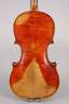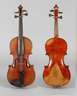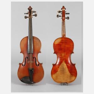 1920er Jahre, mit Modellzettel Antonius Stradivarius Cremonensis, geteilter, gleichmäßig geflammter Boden in bernsteinfarbenem Lack, mit umlaufender, dreiteiliger Randeinlage, rissfreie Decke, rest.bed., mit defektem Bogen, L Korpus 35,4 cm.