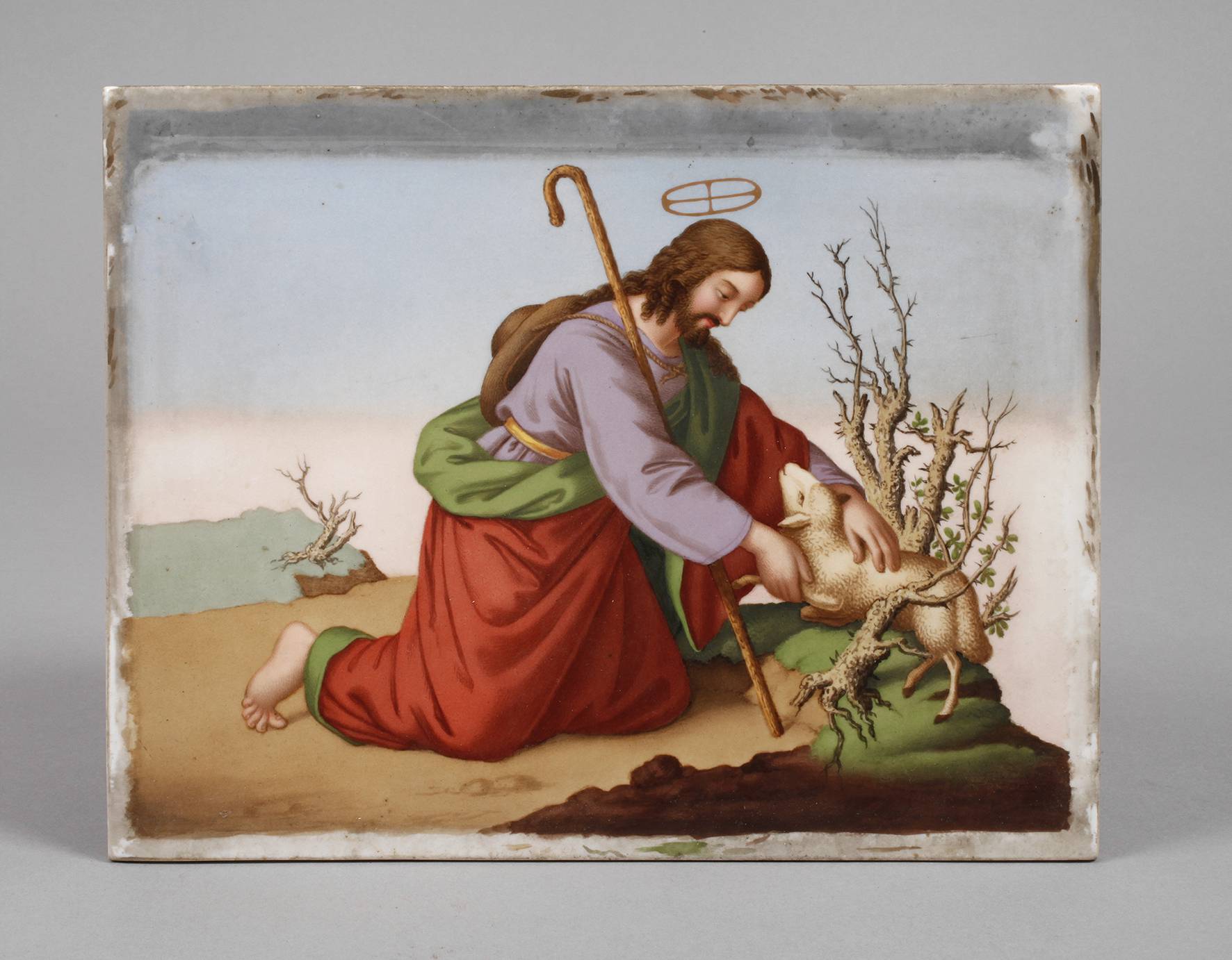um 1920, ungemarkt, rechteckige, flache Platte mit ausgemalter Darstellung Jesus von Nazareth als Hirte mit Lamm, in einer Goldstuckleiste gerahmt, diese beschädigt, Maße Platte 17,0 x 21,5 cm.