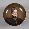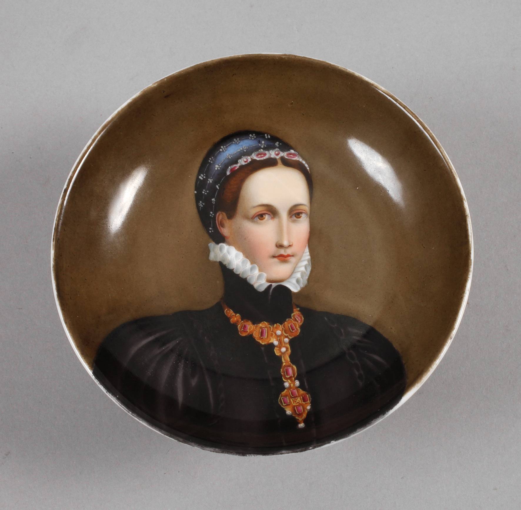 19. Jh., ungemarkt, unsigniert, feine polychrome Aufglasurbemalung, partiell weiß gehöht, Darstellung einer feinen Dame im hochgeschlossenen Gewand, sehr guter Zustand, D 10,5 cm.