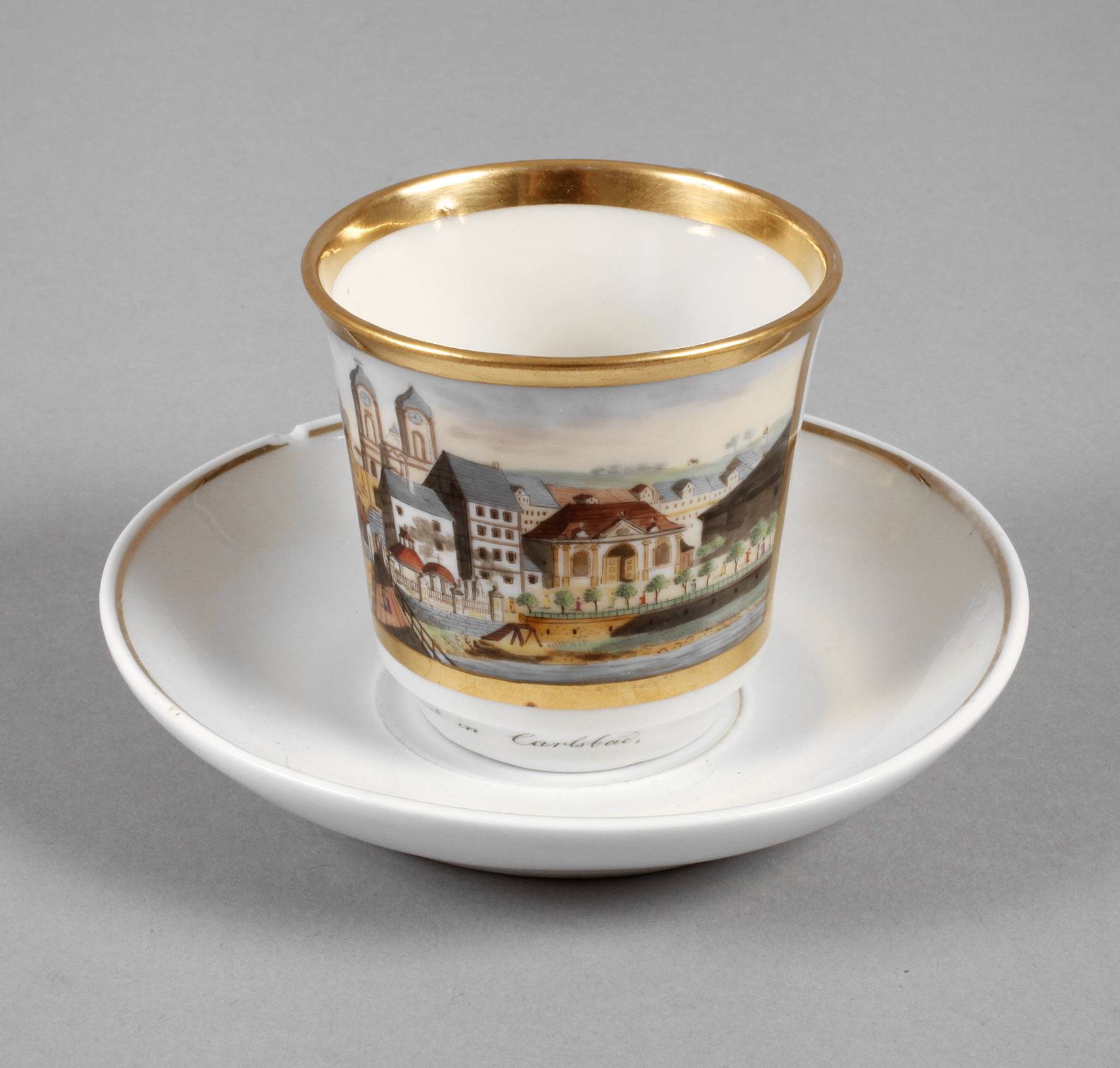 1. Hälfte 19. Jh., undeutlich gemarkt, leicht konische Tasche mit goldgerahmter Rechteckkartusche, fein polychrom bemalt, bezeichnet ”Sprudel in Carlsbad”, guter Zustand mit normalen Altersspuren, dazu eine ergänzte beschädigte Untertasse, H Tasse 6,5 cm.