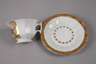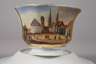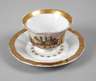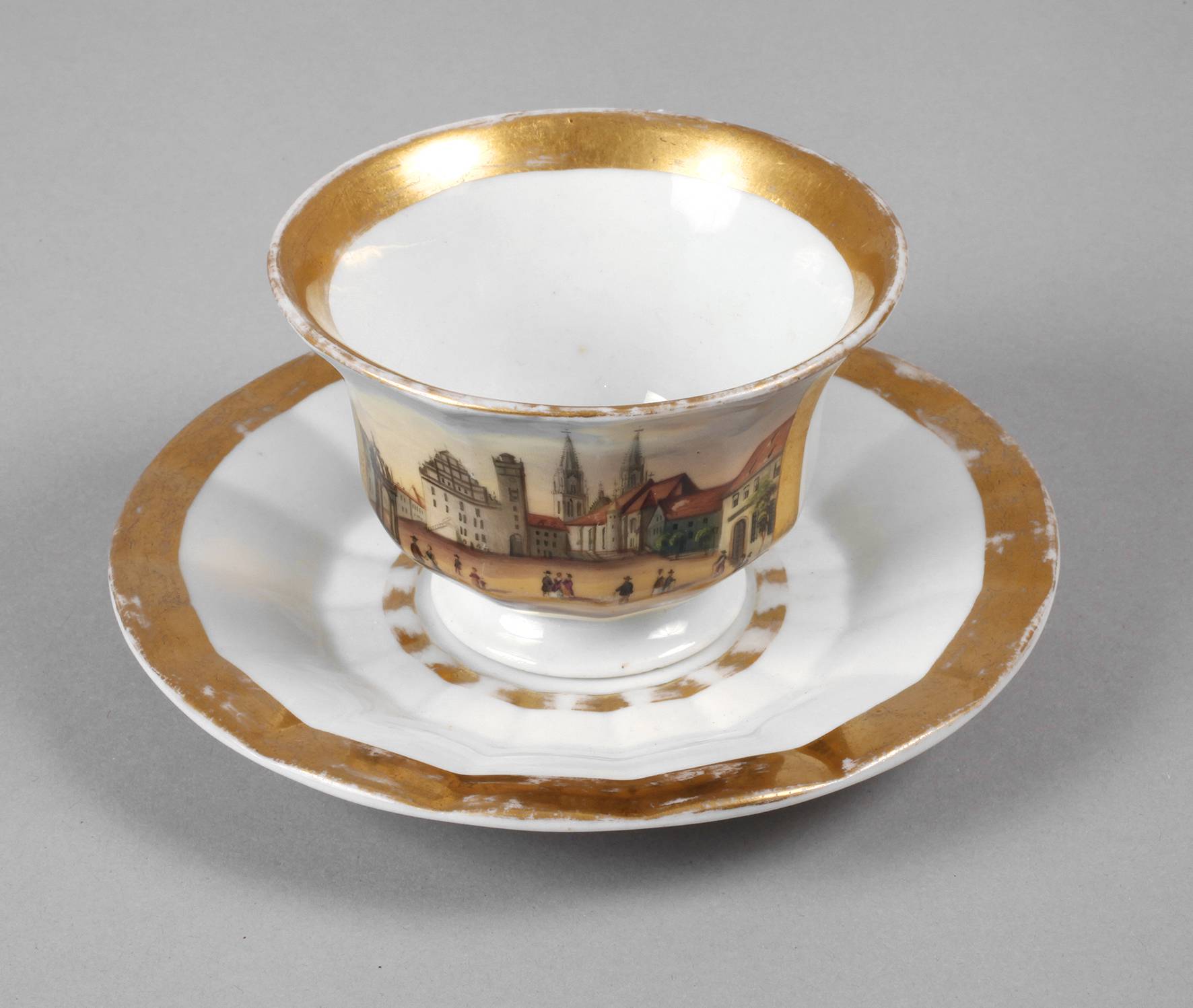 um 1860, ungemarkt, vertikal gerippte Glockentasse mit fein gemalter Rechteckkartusche, Marktplatz mit Figurenstaffage, in Gold gerahmt, originale Untertasse, etwas berieben, sonst unbeschädigter guter Zustand, H zusammen ca. 7 cm.