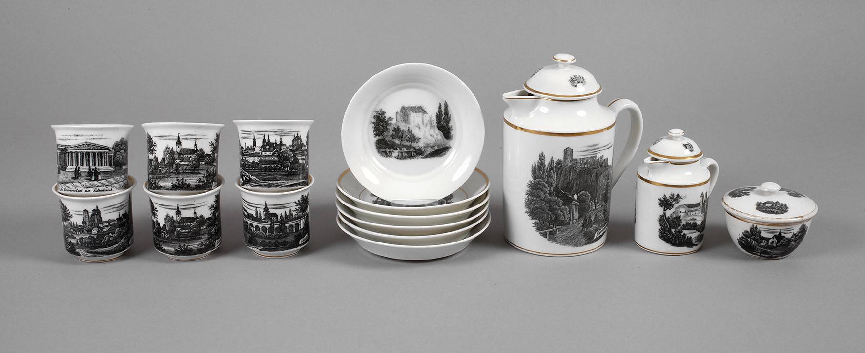 1. Hälfte 19. Jh., gemarkt CF Pirkenhammer, schwarz bedruckt und vergoldet, Kernstück und sechs Tassen mit Untertassen (eine ergänzt), Ansichten von Rauhenstein, Klosterneuburg, usw., stärkere Gebrauchs- und Altersspuren, H Kanne 17,5 cm.