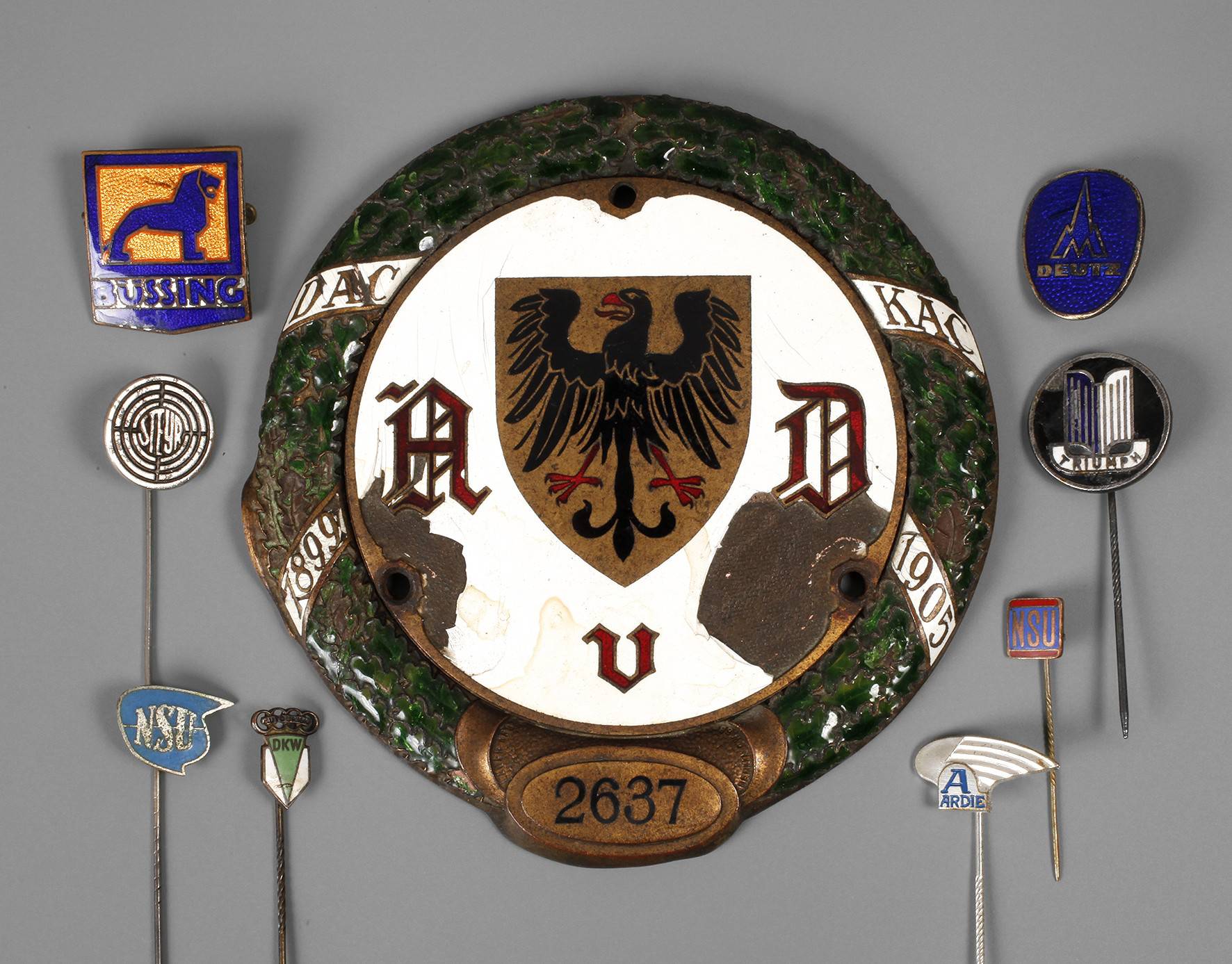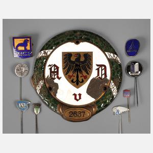 bestehend aus großer Plakette des kaiserlichen Automobilclubs (Nr. 2637), Hersteller Lauer Nürnberg-Berlin, sowie acht Anstecknadeln und -abzeichen: NSU (2 x), Deutz, Steyr, Triumph, Büssing, DKW, Ardie, jeweils Alters- und Gebrauchsspuren, teilweise emailliert.