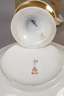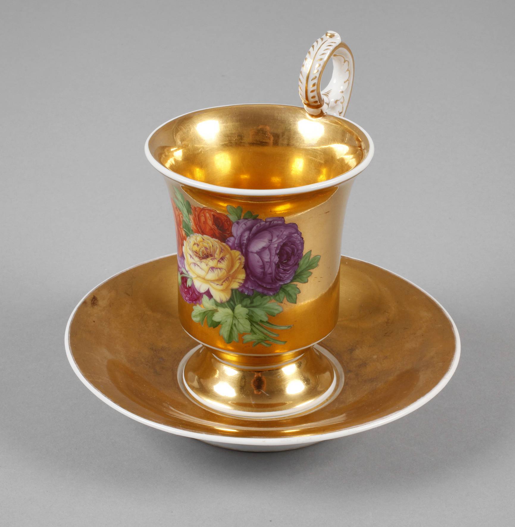 1. Hälfte 19. Jh., blaue Zeptermarke, rote Reichsapfelmarke, Tasse in hoher Glockenform mit Volutenhenkel, reich vergoldet, schauseitig mit Rosenblüten fein bemalt, passende Untertasse, diese im Spiegel mit einer Rosette, normale Altersspuren, H zusammen ca. 14 cm.