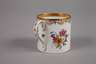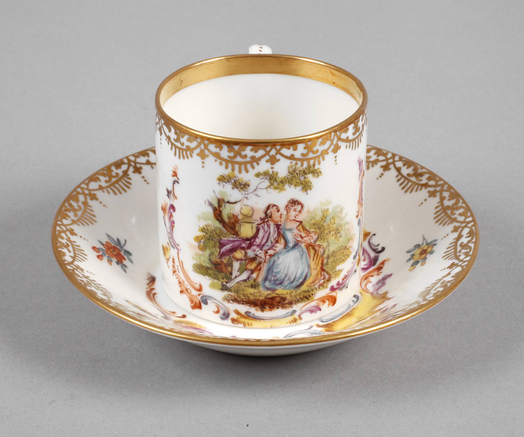 Jahreseichen ”C” 1903, blaue Zeptermarke, ein Schleifstrich, polychrome Aufglasurbemalung und Vergoldung, Watteauszenen im barocken Stil, mit Blütenbuketts, Streublümchen, Insektenmalerei und Goldbordüren, guter Zustand, H zusammen ca. 5,5 cm.