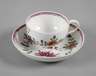 um 1800, blaue Knaufschwerter mit Stern, in Mangan gepinselte Nummern 69 und 41, Aufglasurbemalung mit Blütenranken, flache Tasse mit Ohrenhenkel, dieser am Abschluss geklebt, Gebrauchsspuren, H zusammen ca. 6 cm.