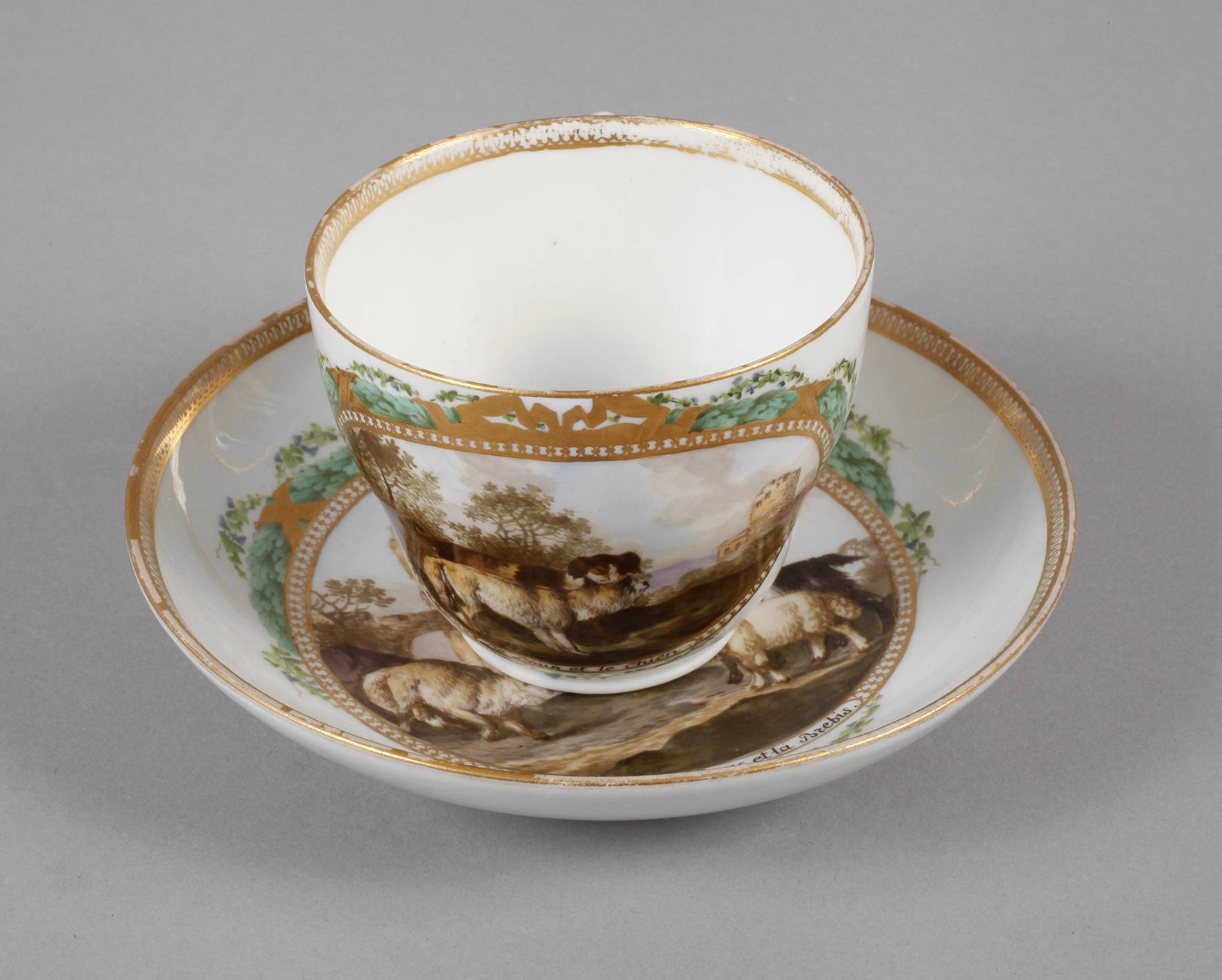 Marcolinizeit um 1800, blaue Schwertermarke mit Stern und Nr. 4, zweifach gebauchte Tasse mit verschlungenen Asthenkeln, feine polychrome Aufglasurbemalung, radierte Goldmalerei, in einer ovalen Kartusche Hütehund und Wolf in sommerlicher Landschaft mit Ruine, passende Untertasse mit ähnlicher Darstellung, bezeichnet ”Le Loup et le Chien” ( Der Wolf und der Hund) und ”Le Loup le Bouc et la Brebis” (Der Wolf, die Ziege und das Mutterschaf), Vergoldung etwas berieben, H zusammen ca. 7 cm.