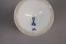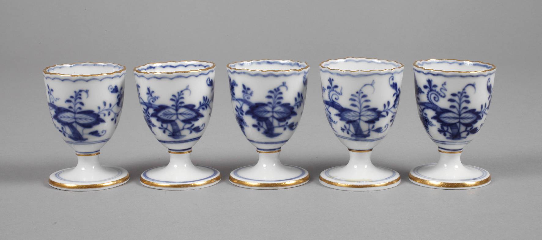um 1900, blaue Knaufschwerter, 1. Wahl, kobaltblaue Unterglasurbemalung und Vergoldung, die oberen Ränder gewellt, guter Zustand, H je 6,5 cm.