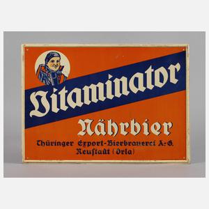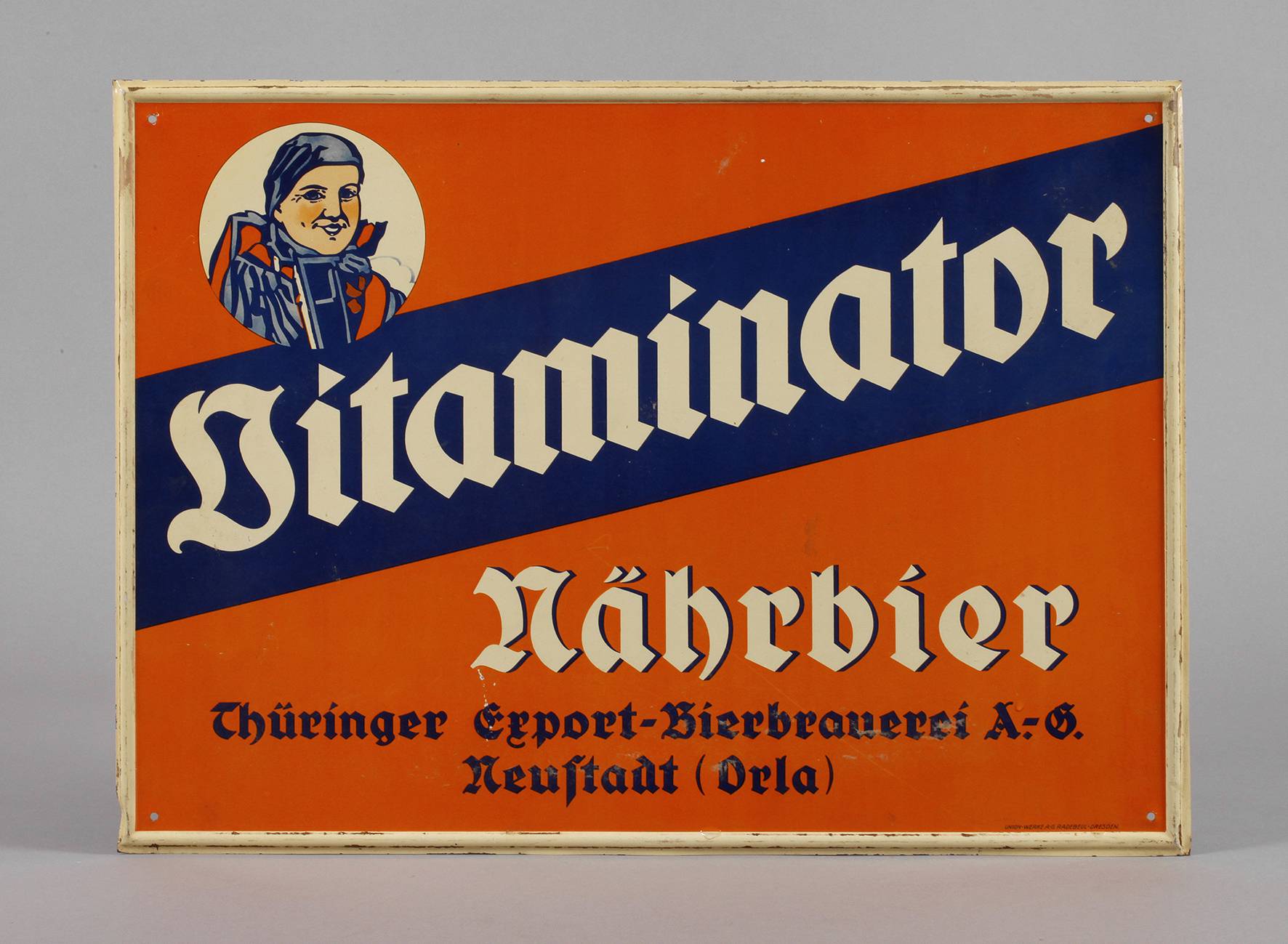 1920er Jahre, Herstellervermerk Union-Werke AG Radebeul-Dresden, mehrfarbig lithografiertes Weißblech für die Thüringer Exportbier Brauerei AG Neustadt Orla, vier originale Bohrungen, min. Altersspuren, Z 1, Maße 36 x 50 cm.