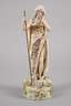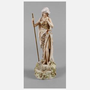 1930er Jahre, Reliefmarke, Modellnummer 352, matte Aufglasurbemalung und Vergoldung, im Fellmantel mit Ziegenbock, auf einem naturalistischen Sockel stehend, vergoldeter Holzstab, minimalst bestoßen, H 30 cm.