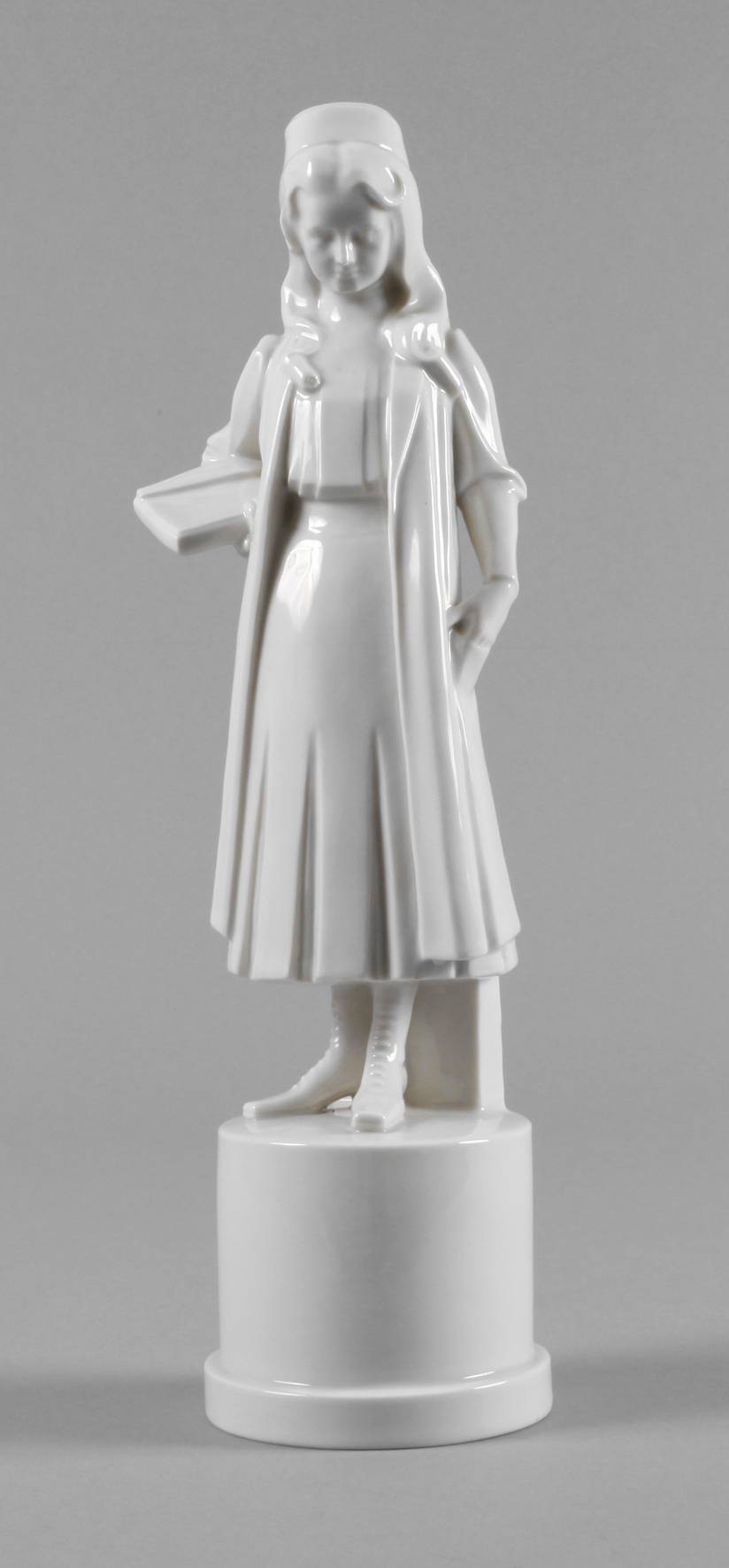 Entwurf Otto Thiem um 1908, Prägemarke, Modellnummer 1, junges Mädchen mit Notenmappe, auf einem Rundsockel stehend, Ausführung in Weißporzellan, guter unbeschädigter Zustand, H 34 cm.