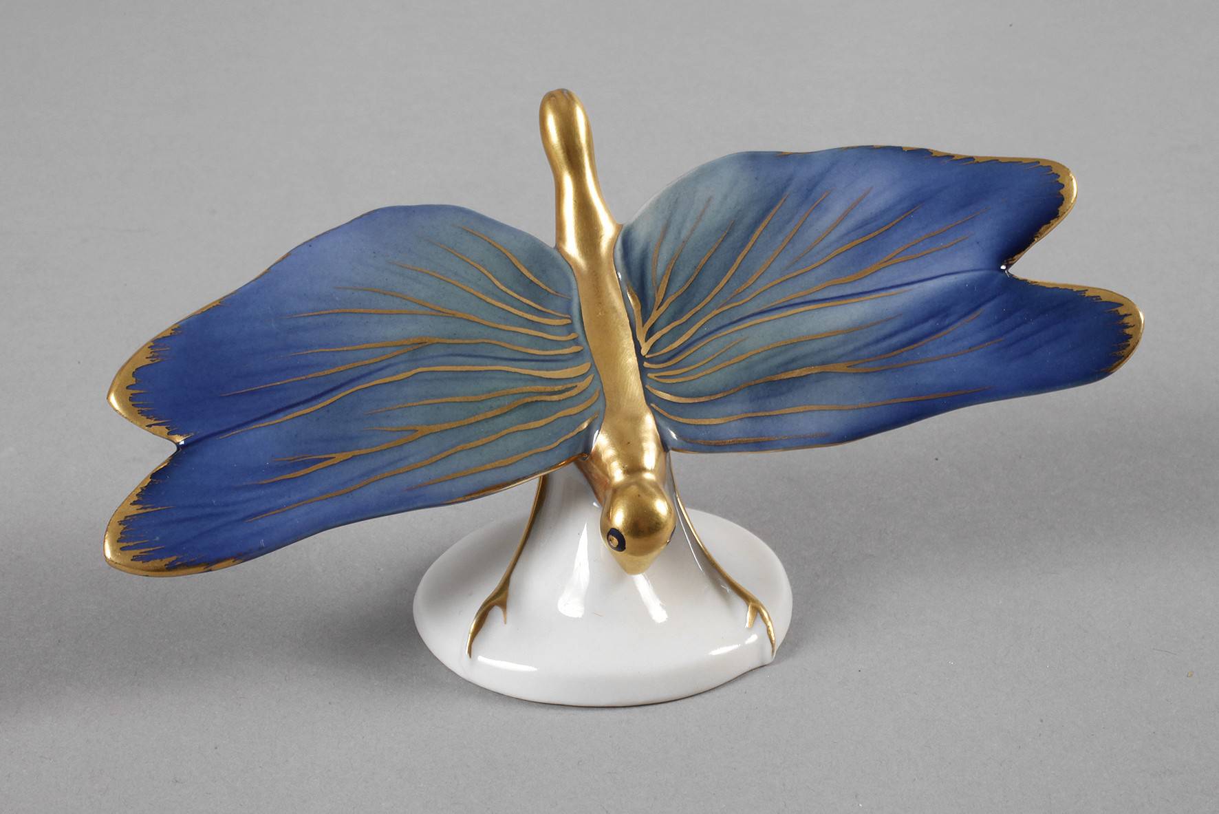 1. Hälfte 20. Jh., blaue Pinselmarke ”Aelteste Volkstedter Porzellanmanufaktur”, Unterglasurbemalung und Vergoldung, in naturalistischer Ausformung auf einem Sockel sitzend, guter unbeschädigter Zustand, L 14 cm.