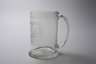 Mitte 18. Jh., farbloses Glas, blasiger Abriss, konisch mit ausgestelltem Stand und breitem Bandhenkel, feiner Mattschliffdekor, zwei Figuren und Bäume in Arkaden, Spruch: ”Hir haben mir unser einziges Vergenigen”, normale Altersspuren, ohne Beschädigungen, H 16 cm.