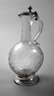 um 1800, farbloses Glas, blasiger Abriss, angesetzter Fuß, abgeflachte Kugelform, mit geschliffenen stilisierten Floralmotiven, frei geformter Henkel, Zinnmontierung mit Kugeldrücker, Griffende von der Herstellung etwas unsauber, Gebrauchsspuren (Glas matt), H 26 cm.