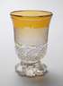 Mitte 19. Jh., farbloses Glas, partiell gelb gebeizt, Walzenschlifffuß und Steineldekor, unbezeichnetes Gartenlandschaftsdekor mit drei Gebäuden, am Lippenrand bestoßen, H 12,5 cm.