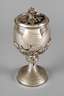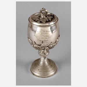 gestempelt 12 Lot, Vertriebsstempel Wagner, zweiteilig verschraubt, mit appliziertem Weinlaub, abnehmbarer Deckel, innen vergoldet, Gravur: Dem Herrn & Grüner in Glauchau zur Feier seines 25.jährigen Jubiläums am 1. November 1857. Kratz & Burk, normale Altersspuren, H 26 cm, G ca. 516 g.