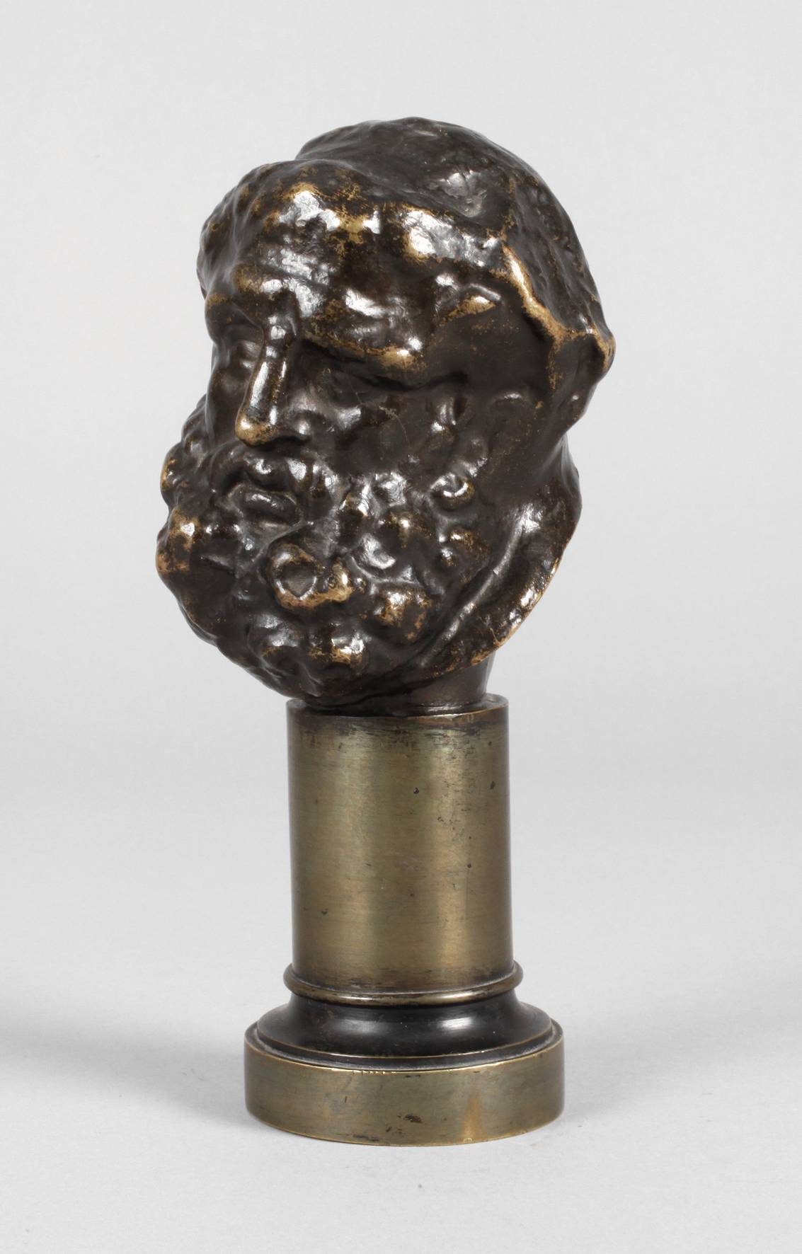 wohl 17. Jh., unsigniert, Bronze dunkel patiniert, leicht abstrahierte Kopfdarstellung des Philosophen, auf hohem, getrepptem und gekehltem Rundsockel, partiell berieben und Altersspuren, H gesamt ca. 18,5 cm.