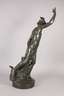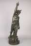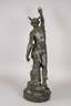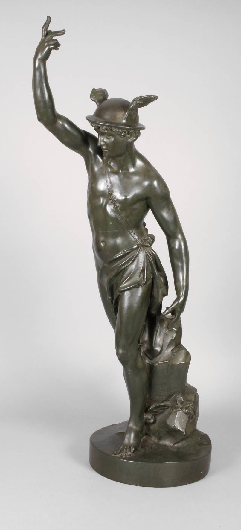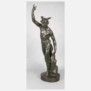 um 1900, unsigniert, Stukko galvanisch verkupfert und dunkelgrün patiniert, Darstellung des Hermes als Akt, mit geflügelten Füßen und ebenfalls geflügeltem, breitkrempigem Hut, lediglich von einem Tuch verhüllt, in der griechischen Mythologie gilt er als Schutzgott zahlreicher Gruppen wie Reisender, Kaufleute, Hirten, Dieben, Kunsthändler, aber auch als Gott der Redekunst, Gymnastik und Magie, weiterhin überbringt er als Götterbote die Beschlüsse des Zeus und begleitet verstorbene Seelen in die Unterwelt, er ist einer der zwölf großen Olympischen Götter, Darstellung auf kleiner runder Plinthe mit naturalistischen Elementen, gute Erhaltung, H gesamt ca. 112 cm.