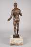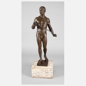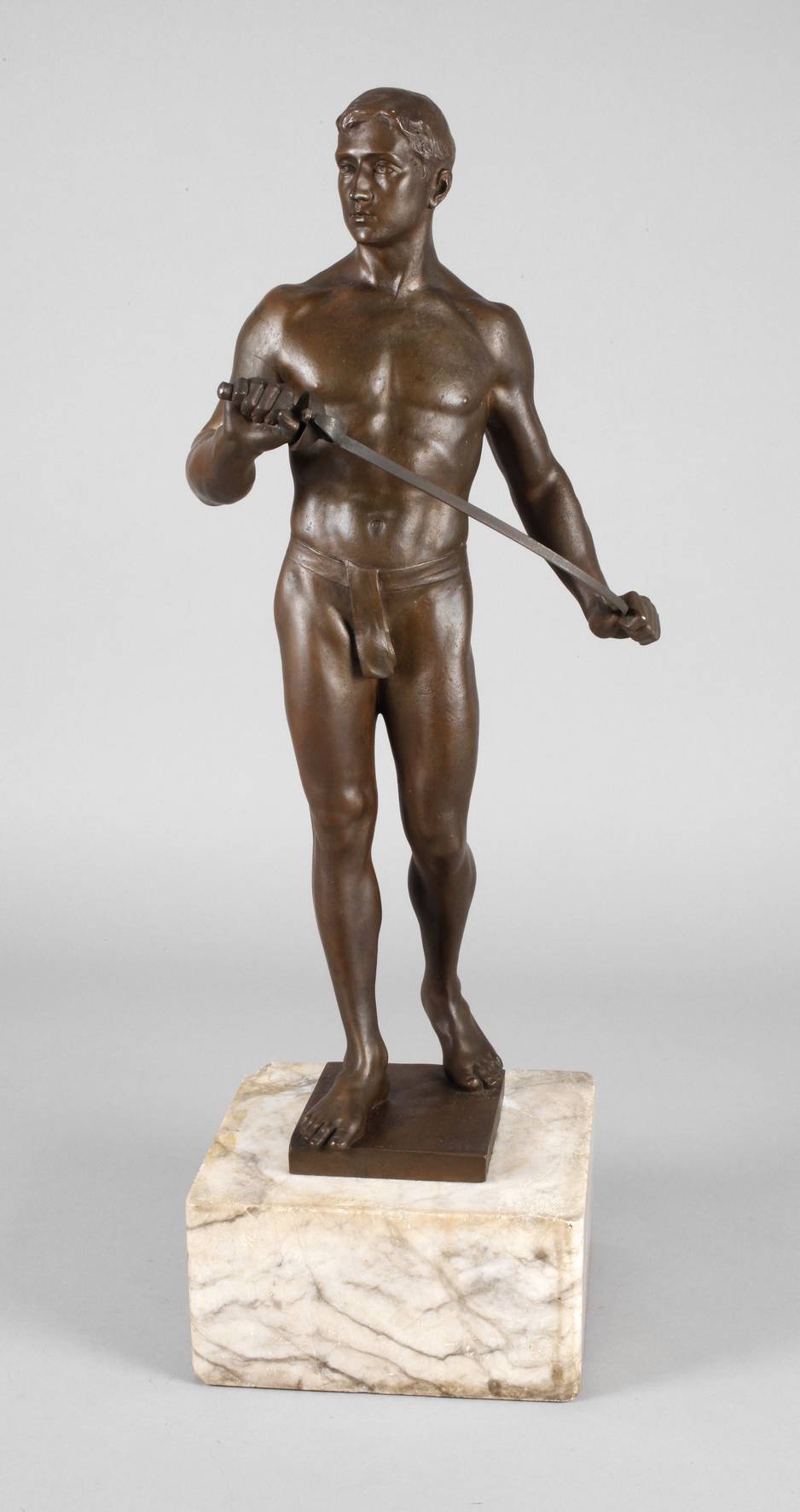 datiert Berlin 1909, signiert, verso unleserlicher Gießerstempel der Gießerei Bräunlich & Langholz, Bronze dunkelbraun patiniert, heroische Darstellung eines Männerakts, lediglich mit einem Lendengurt bekleidet, ein Schwert in den Händen haltend, auf kleiner rechteckiger Plinthe, auf einen großen hellen Marmorsockel montiert, dieser teils bestoßen und am unteren Rand mit größerem, begradigtem Ausbruch, H Bronze ca. 60, H gesamt ca. 72 cm. Künstlerinfo: deutscher Bildhauer (1873 Mönchengladbach bis 1955 Berlin), studierte an den Akademien in Hanau, Paris und Brüssel, seit 1904 in Berlin tätig, fertigte anfangs vor allem lebensgroße Marmorfiguren, später zunehmend weibliche Akte und wählte Motive aus der Sagenwelt, war auf den Großen Deutschen Kunstausstellungen 1939–1943 im Haus der Deutschen Kunst in München vertreten. Quelle: Thieme-Becker.