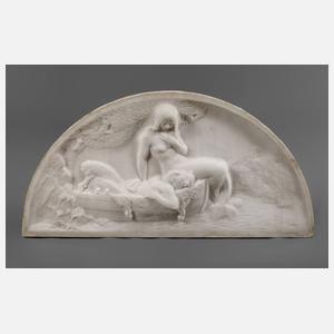 datiert 1908, Künstlersignatur, Marmor, reliefierte Darstellung einer Nixe, welche, unter einem Baum sitzend, einen Pan pflegt, der ermüdet in einem Boot liegt, B 87 x H 44 cm.
