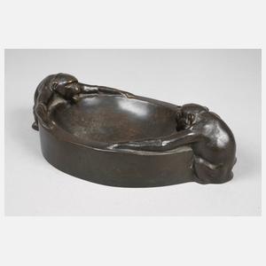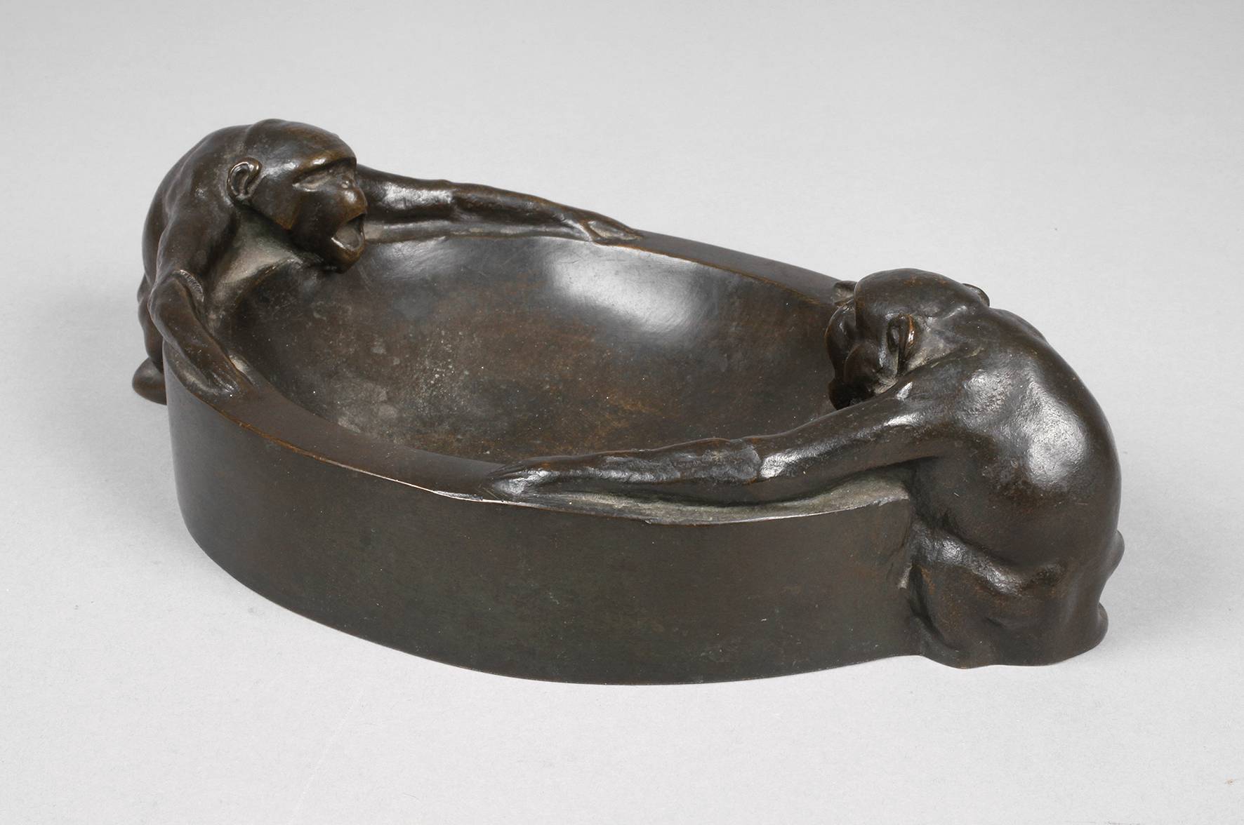 Anfang 20. Jh., signiert: ”Otto Pilz Blasewitz”, Bronze dunkelgrün patiniert, tief gemuldete, ovale Schale mit zwei Griffen als Affen, minimale Gebrauchsspuren, sonst sehr gut erhalten, H ca. 6,8 cm, L ca. 24 cm. Künstlerinfo: deutscher Tierbildhauer (1876 Sonneberg bis 1934 Dresden), stud. a.d. Kunstgewerbeschule in Dresden und an der Akademie in Berlin, Mitglied der Dresdner Kunstgenossenschaft und im Reichsverband Bildender Künstler Deutschlands, fertigte Modelle für die Manufaktur Meissen, diese erwarb etwa 30 Modelle zwischen 1905–1913, hauptsächlich Genre- und Tierfiguren, Quelle: Bergmann, Meissner Künstler-Figuren, S. 667.