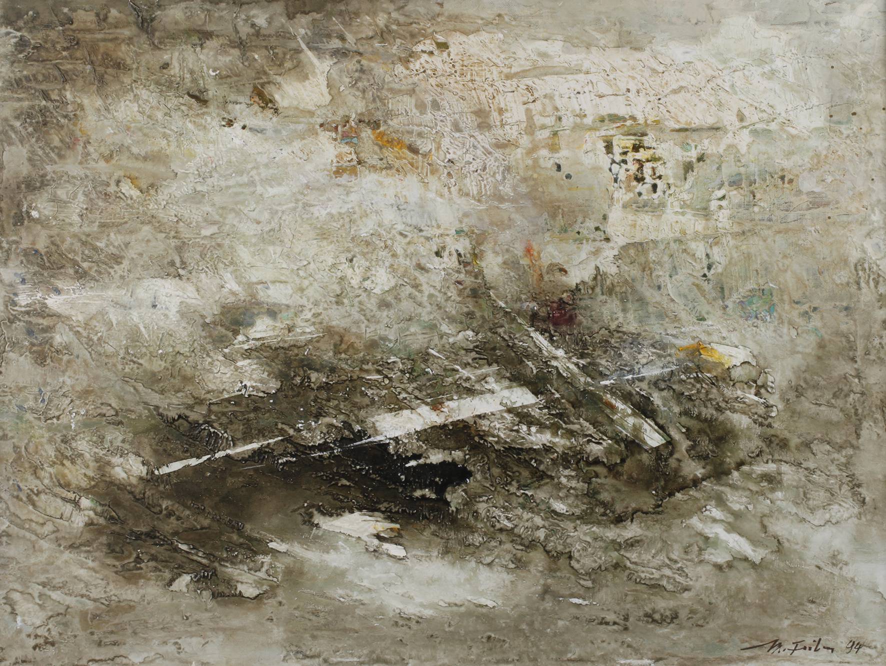 abstrakte Komposition, Lasuren über pastoser Grundierung, Öl auf Leinwand, rechts unten signiert und datiert ”M. Feiler (19)94”, rückseitig betitelt ”Urzeichen”, diverse Nummerierungen und Rahmungsetikett der Galerie Fritz Geyer Plauen, gerahmt, Falzmaße ca. 60 x 80 cm. Künstlerinfo: dt. Maler, Entwerfer und Illustrator (geboren 1925 in Plauen im Vogtland), 1939–43 Schüler der Plauener Kunstschule, gefördert von Kurt Geipel und Walter Löbering, Malaufenthalte in Venedig und auf Mallorca, tätig in Plauen, Quelle: Vollmer, Frank Weiß ”Malerei im Vogtland” und Internet.