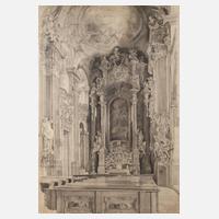 Innenraumansicht mit Blick zum barocken Hochaltar der Matthiaskirche in Breslau, Kimbel wuchs in Breslau auf, offenbar scheint das Innere von St. Matthias einen nachhaltigen Eindruck auf den Künstler hinterlassen zu haben, bereits 1915 veröffentlichte die Zeitschrift "Innendekoration" das Motiv nach einer Lithographie Kimbels, die vorliegende Zeichnung entstand 1940 und scheint zur Ausstattung der Wohnung Kimbels gehört zu haben, auf einem Altersfoto des Künstlers im Arbeitszimmer ist das Motiv im Hintergrund erkennbar (vgl. beigefügten Ausdruck), Bleistiftzeichnung, rechts unten betitelt, datiert und signiert "Matthiaskirche Breslau, 28. Mai 1940 Wilhelm Kimbel", Altersspuren, ungerahmt, Maße ca. 100 x 69,5 cm. Künstlerinfo: dt. Ebenist, Zeichner, Maler, Aquarellist, Lithograph, Kunsthandwerker und Innenarchitekt sowie Kunstsammler (1868 Breslau bis 1965 Zehdenick), entstammt einer Kunsttischlerfamilie aus Mainz, ab 1882 Lehre zum Kunsttischler in Hamburg, anschließend Zeichenschüler seines Vaters, des Kunsttischlers und Möbelentwerfers Martin Kimbel in Breslau, ab 1886 als Zeichner in Potschappel, Bayreuth und in Berlin bei "Cremer und Wolffenstein" tätig, später als Zeichner in Köln und Mainz, 1889–94 Studienaufenthalt in New York, hier zunächst Schüler seines Onkels Anton Kimbel, anschließend freischaffend als Architekt und Zeichner, 1894–97 Mitarbeit im väterlichen Unternehmen in Breslau, 1897 Gründung der Firma für Inneneinrichtung "Kimbel & Friedrichsen" mit Aßmus Friedrichsen, schuf unter anderem Innenraumgestaltungen für das Schloss Paulinum bei Hirschberg, das Stadtschloss, das Zeughaus und das Kronprinzenpalais Berlin sowie das Schloss Wernigerode, Saalbauten der Deutschen Bank in Berlin, den Speisesaal im Hotel Adlon Berlin und 1922–29 Gestaltung von Passagierschiffen der HAPAG, 1904 Grand Prix auf der Weltausstellung St. Louis, 1908 durch Kaiser Wilhelm II. Ernennung zum Hofzeichner und Hofkunsttischler, 1908 Ehrung mit der goldenen Medaille für Kunst auf der Großen Berliner Kunstausstellung, schuf mehrere Beiträge für die Zeitschriften "Innendekoration" und "Deutsche Bauzeitung", 1931 Bankrott der Firma, 1933 Übersiedlung nach Zehdenick und verstärkt als Maler tätig, Mitglied der Reichskammer der bildenden Künste und im Verein Berliner Künstler, wirkte ferner als Berliner Stadtverordneter und Mitglied der städtischen Kunstdeputation, Quelle: Thieme-Becker, Saur "Bio-Bibliographisches Künstlerlexikon", Dressler, Akten der Reichskammer der bildenden Künste Berlin und Wikipedia.