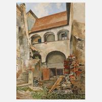 idyllischer Winkel im altehrwürdigen, morbiden Anwesen in Niederösterreich, Mischtechnik, um 1940, links unten signiert "W. Kimbel" und rechts unten betitelt "Spitz a. d. Donau Hundrieser Hof", Altersspuren, ungerahmt, Maße ca. 70 x 50 cm. Künstlerinfo: dt. Ebenist, Zeichner, Maler, Aquarellist, Lithograph, Kunsthandwerker und Innenarchitekt sowie Kunstsammler (1868 Breslau bis 1965 Zehdenick), entstammt einer Kunsttischlerfamilie aus Mainz, ab 1882 Lehre zum Kunsttischler in Hamburg, anschließend Zeichenschüler seines Vaters, des Kunsttischlers und Möbelentwerfers Martin Kimbel in Breslau, ab 1886 als Zeichner in Potschappel, Bayreuth und in Berlin bei "Cremer und Wolffenstein" tätig, später als Zeichner in Köln und Mainz, 1889–94 Studienaufenthalt in New York, hier zunächst Schüler seines Onkels Anton Kimbel, anschließend freischaffend als Architekt und Zeichner, 1894–97 Mitarbeit im väterlichen Unternehmen in Breslau, 1897 Gründung der Firma für Inneneinrichtung "Kimbel & Friedrichsen" mit Aßmus Friedrichsen, schuf unter anderem Innenraumgestaltungen für das Schloss Paulinum bei Hirschberg, das Stadtschloss, das Zeughaus und das Kronprinzenpalais Berlin sowie das Schloss Wernigerode, Saalbauten der Deutschen Bank in Berlin, den Speisesaal im Hotel Adlon Berlin und 1922–29 Gestaltung von Passagierschiffen der HAPAG, 1904 Grand Prix auf der Weltausstellung St. Louis, 1908 durch Kaiser Wilhelm II. Ernennung zum Hofzeichner und Hofkunsttischler, 1908 Ehrung mit der goldenen Medaille für Kunst auf der Großen Berliner Kunstausstellung, schuf mehrere Beiträge für die Zeitschriften "Innendekoration" und "Deutsche Bauzeitung", 1931 Bankrott der Firma, 1933 Übersiedlung nach Zehdenick und verstärkt als Maler tätig, Mitglied der Reichskammer der bildenden Künste und im Verein Berliner Künstler, wirkte ferner als Berliner Stadtverordneter und Mitglied der städtischen Kunstdeputation, Quelle: Thieme-Becker, Saur "Bio-Bibliographisches Künstlerlexikon", Dressler, Akten der Reichskammer der bildenden Künste Berlin und Wikipedia.