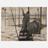 zwei Fischer in ihrem Kahn, beim Leeren ihrer Reusen am Ufer des Sees, umgeben von einigen Vögeln, die bereits den einen oder anderen Fisch erbeutet haben, Aquarell und Deckfarben auf Karton, links unten signiert, datiert und bezeichnet „Paul Klimsch (19)00 Frankfurt a/M.“, geringe Altersspuren, hinter Glas gerahmt, Darstellungsmaß ca. 36,7 x 47,8 cm. Künstlerinfo: auch Hans Paul Klimsch, dt. Landschafts- und Tiermaler sowie Illustrator (1868 Frankfurt am Main bis 1917 Frankfurt), Mitglied einer Frankfurter Künstlerfamilie, studierte 1886-91 an der Akademie Karlsruhe bei Ernst Schurth und Hermann Baisch, 1892-1900 in München ansässig und weitergebildet bei René Reinicke, ab 1900 in Frankfurt am Main und zeitweise in Frankfurt-Niederursel tätig, beschickte die Große Berliner Kunstausstellung, die Ausstellungen der Berliner Sezession und den Glaspalast München sowie Ausstellungen in Dresden, Düsseldorf und Wiesbaden, Quelle: Thieme-Becker, Quelle: Thieme-Becker und Wikipedia.