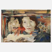 zwei Kinder in Betrachtung der Zierfische, durch das Aquarium gesehen, Deckfarben auf leichtem Karton, unten links signiert und datiert "K. Kohler 1948" auf Unterlagekarton nochmals signiert "Karl Kohler", in Passepartout freigestellt und hinter Glas gerahmt, Blattmaß ca. 26,5 x 38 cm.