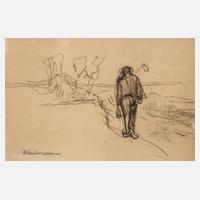 mit lockerem Strich skizzierte Dünenlandschaft mit von der Arbeit heimkehrenden Bauern, Kohle auf Papier, um 1910-20, rechts unten signiert "MLiebermann", lichtrandig, unter Passepartout und hinter Glas gerahmt, Passepartoutausschnitt ca. 11,5 x 17 cm. Künstlerinfo: dt.-jüdischer Maler, Graphiker und Illustrator (1847 Berlin bis 1935 Berlin), zunächst auf väterlichen Wunsch ab 1866 Studium der Chemie an der Friedrich-Wilhelm-Universität Berlin, parallel 1866-68 Malschüler von Carl Constantin Heinrich Steffeck, 1868 Exmatrikulation, studierte 1868-72 an der Akademie Weimar bei Paul Thumann und Ferdinand Wilhelm Pauwels, mit Theodor Hagen 1871 Reise nach Düsseldorf, hier beeinflusst von Mihály Munkácsy, anschließend Studienreise nach Amsterdam und Scheveningen, 1873-78 Atelier in Montmartre in Paris und Aufenthalte in Barbizon, 1875 Reisen nach Zandvoort und Haarlem in Holland, 1876 nach Amsterdam, 1878 Italienreise mit Aufenthalt in Venedig, hier Treffen mit Franz von Lenbach, anschließend in München tätig, ab 1979 regelmäßige Aufenthalte im Dachauer Moos, Rosenheim und im Inntal, 1880 in Dongen in Brabant und erneuter Aufenthalt in Amsterdam, in der Folge entstand sein berühmtes Gemälde "Altmännerhaus in Amsterdam" in Lichtmalerei, welches seinen künstlerischen Erfolg begründete und erstmals die „Liebermann'schen Sonnenflecken“ aufwies, 1884 Rückkehr nach Berlin, 1884 Hochzeit mit Martha Marckwald und Hochzeitsreise über Braunschweig und Wiesbaden nach Scheveningen, Laren, Delden, Haarlem und Amsterdam, 1885 Mitglied des Vereins Berliner Künstler, beschickte ab 1886 die Berliner Akademieausstellungen, 1889 Berufung in die Jury der Pariser Weltausstellung, hier Ehrenmedaille und der Aufnahme in die Société des Beaux-Arts, 1892 Mitglied der Künstlergruppe "Vereinigung der XI", 1892 Gründungsmitglied der "Freien Künstlervereinigung", 1896 Parisaufenthalt und Ehrung als Ritter der Ehrenlegion, 1897 Personalausstellung in der Akademie der Künste und Ehrung mit der Großen Goldenen Medaille und dem Professorentitel, 1898 Aufnahme in die Akademie der Künste, 1898 Gründungsmitglied und später bis 1911 Präsident, danach Ehrenpräsident der Berliner Sezession, 1909 Errichtung des Landsitzes am Wannsee, 1912 Ehrung mit dem Hausorden von Oranien, Mitglied des Senats der Akademie der Künste, Ehrendoktor der Berliner Universität sowie Ernennung zum Ehrenmitglied der Kunstakademien München, Weimar, Dresden, Wien, Brüssel, Mailand und Stockholm, 1914 Austritt aus der Berliner Sezession und Gründung der "Freien Sezession", lieferte im 1. Weltkrieg Beiträge für die Zeitschrift "Kriegszeit - Künstlerflugblätter" von Paul Cassirer, ab 1916 erste Illustrationen, 1917 Ehrung mit dem Roten Adlerorden III. Klasse durch Kaiser Wilhelm II., 1920-33 Präsident bzw. Ehrenpräsident der Akademie der Künste, 1927 Ehrenbürgerwürde von Berlin, Ehrung mit dem "Adlerschild des Deutschen Reiches" durch Paul von Hindenburg, 1933 Rücktritt von allen Ämtern, Quelle: Thieme-Becker, Vollmer, Dressler, Wikipedia und Internet.