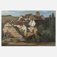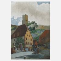 Blick von einem kleinen Platz mit ortstypischer Bebauung auf einen Hügel mit Burgruine, Gouache und Graphit auf Papier, rechts unten signiert und datiert "G. Müller 1908", hinter Glas gerahmt, Falzmaß ca. 45,5 x 33 cm.