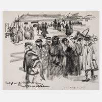 mehrere Menschengruppen auf einem von loser Umbauung eingesäumten Platz, mit gekonnten Strich erfasste Szenerie, Kohle auf leichtem Karton, unter der Darstellung links unleserlich bezeichnet, datiert und signiert "...1917 Paul Paeschke", rechts unten Widmung "Herrn F. R. Bunck z(um) And.(enken)", geringe Altersspuren, Blattmaß ca. 20,7 x 25,2 cm. Künstlerinfo: dt. Maler und Graphiker (1875 Berlin bis 1943 Berlin), zunächst Ausbildung zum Zeichenlehrer, studierte nach Erhalt des Lehrerexamens 1900-06 an der Akademie Berlin bei Otto Brausewetter und Georg Ludwig Meyn, schließlich Meisterschüler von Karl Koepping, beschickte ab 1905 die Große Berliner Kunstausstellung, unternahm Studienreisen nach Paris, Italien, Spanien und England, 1914-18 Kriegsfreiwilliger im 1. Weltkrieg, unterhielt enge Freundschaft zu Lovis Corinth und Charlotte Berend-Corinth, dreimonatiger Studienaufenthalt mit dem Ehepaar Corinth in Griechenland, während des 2. Weltkriegs als Kunsterzieher in Brandenburg tätig, in zahlreichen Museen vertreten, unter anderem im Kupferstichkabinett Berlin, Dresden, München, Straßburg etc., Mitglied der Berliner Sezession, im Verein Berliner Künstler und des Deutschen Künstlerbundes Weimar, tätig in Berlin-Zehlendorf, Quelle: Thieme-Becker, Vollmer, Dressler, Wirth "Paul Paeschke, einem Berliner Maler zum 100. Geburtstag" und Internet.
